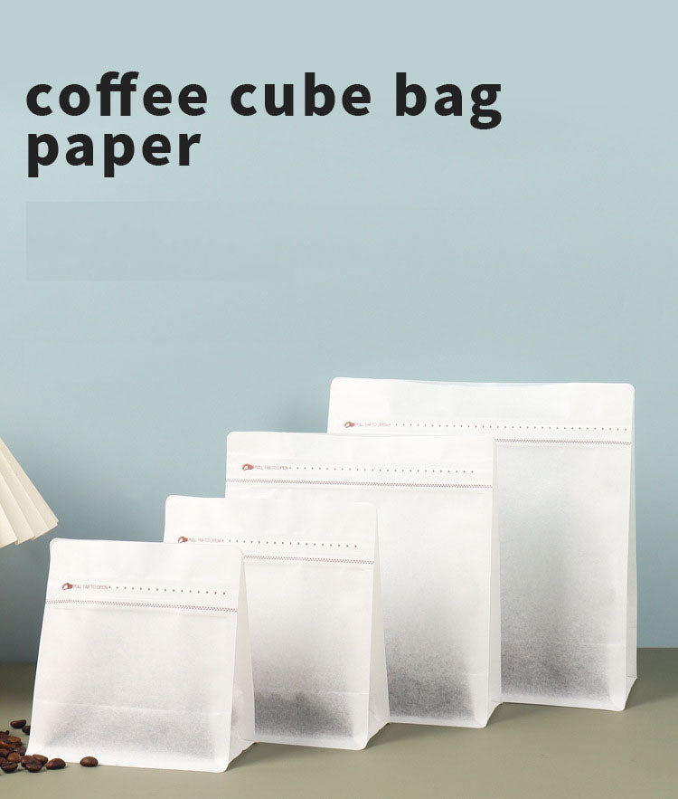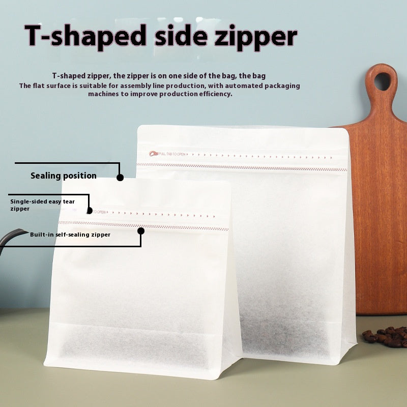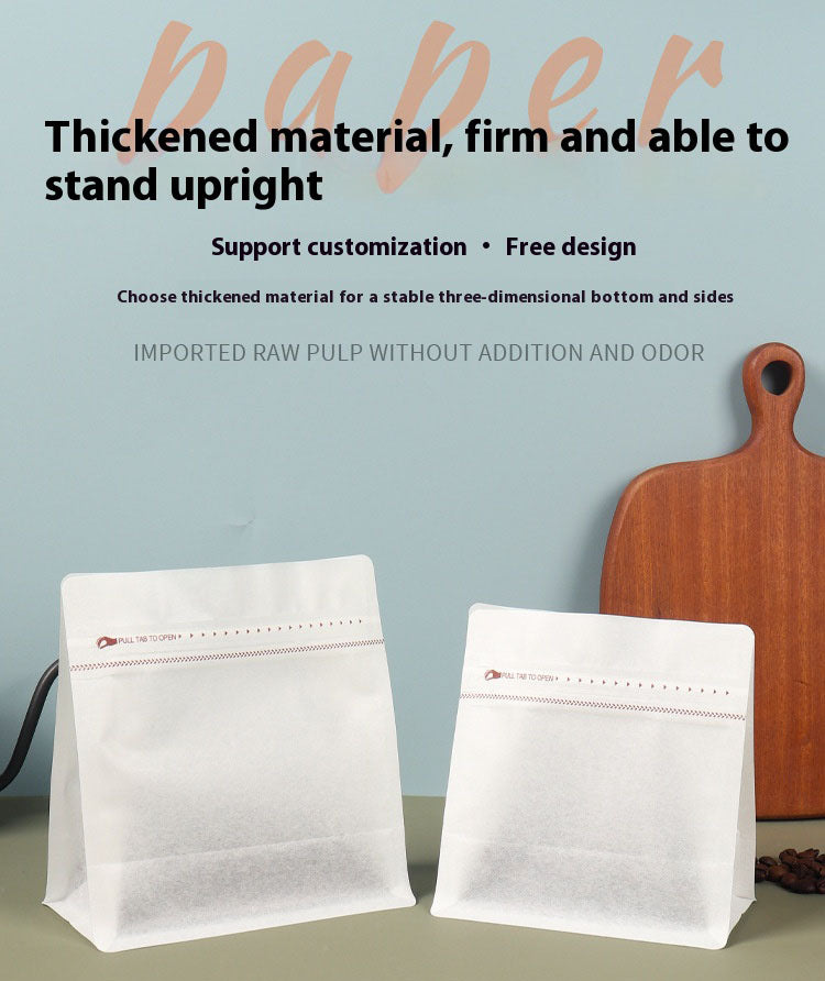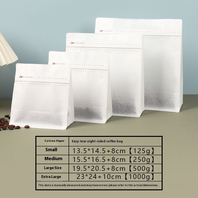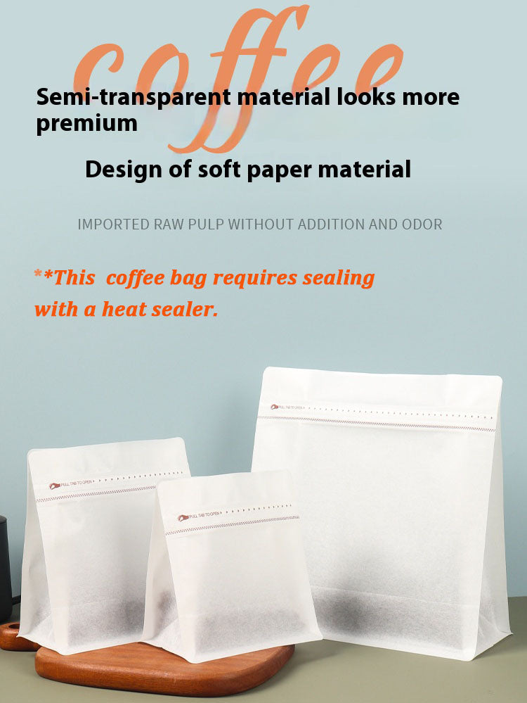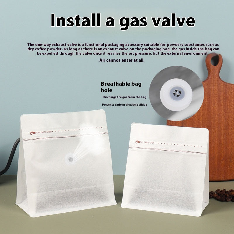 These 50 resealable cotton paper coffee bags feature a flat bottom and side gusset design for stable, upright storage. Each pouch includes a built-in valve that allows coffee to degas while preventing air entry, preserving freshness and aroma. The zipper lock ensures an airtight seal for repeated use, making these pouches ideal for professional coffee packaging that demands both functionality and protection. Crafted from durable cotton paper, they combine eco-friendly materials with practical design to support premium coffee quality.