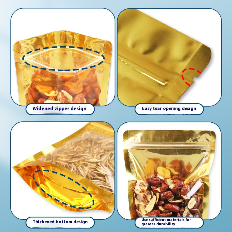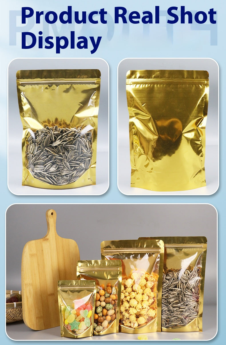 Transparent and Golden Aluminum Stand-Up Zipper Bags Are Here! The semi-transparent design is super thoughtful—you can see the cookies and nuts inside, and the golden aluminum coating adds a touch of elegance, making it look as eye-catching as a small gift box!
