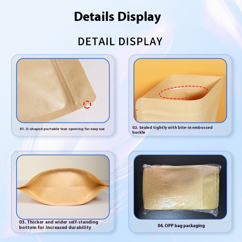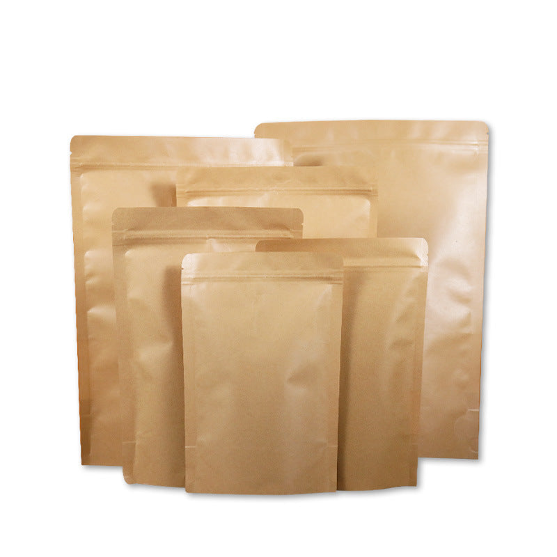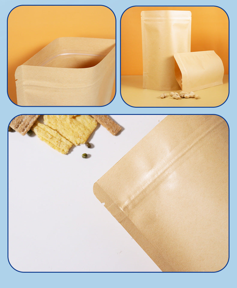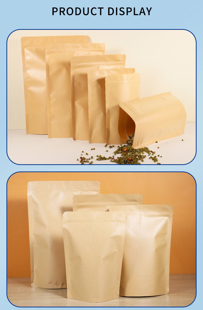 Kraft paper bags with no window, self-standing zipper, and self-sealing closure, the preferred choice for professional packaging. Made of high-strength kraft paper, these bags are sturdy, wear-resistant, and moisture-proof. Available in yellow and white, the no-window design provides dust-proof sealing, while the self-standing structure ensures stability. The zipper closure is reliable and reusable.