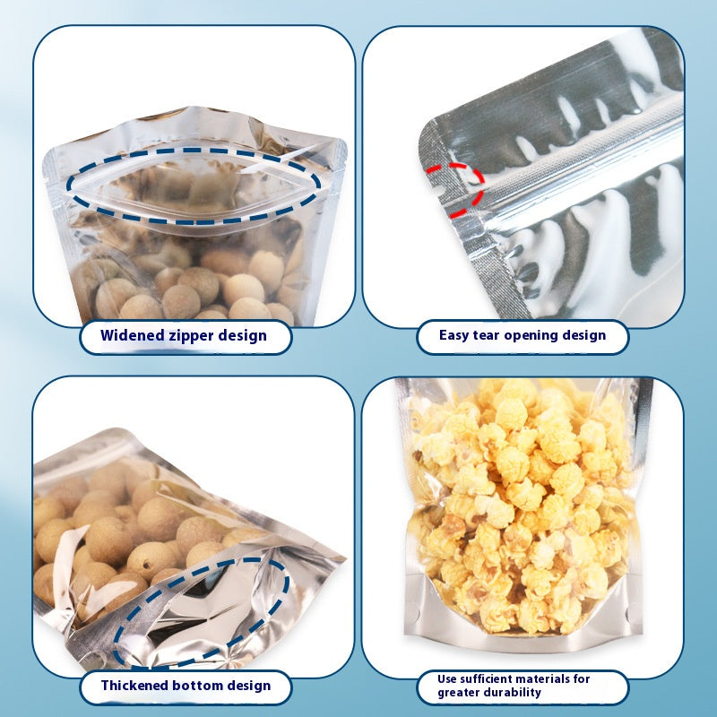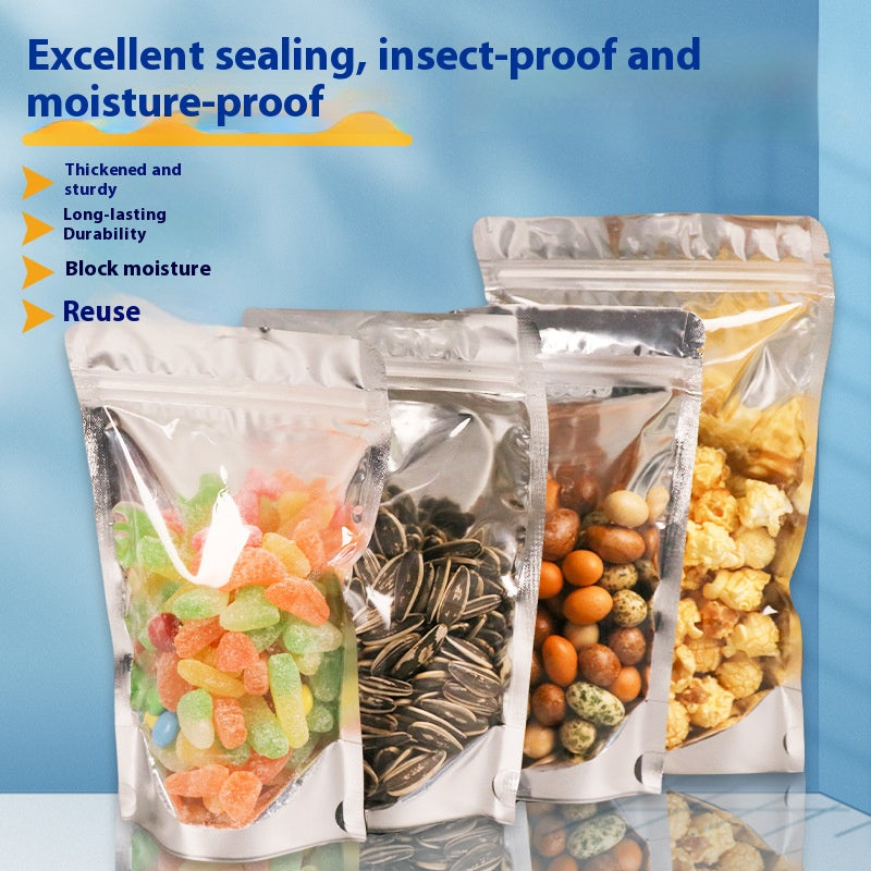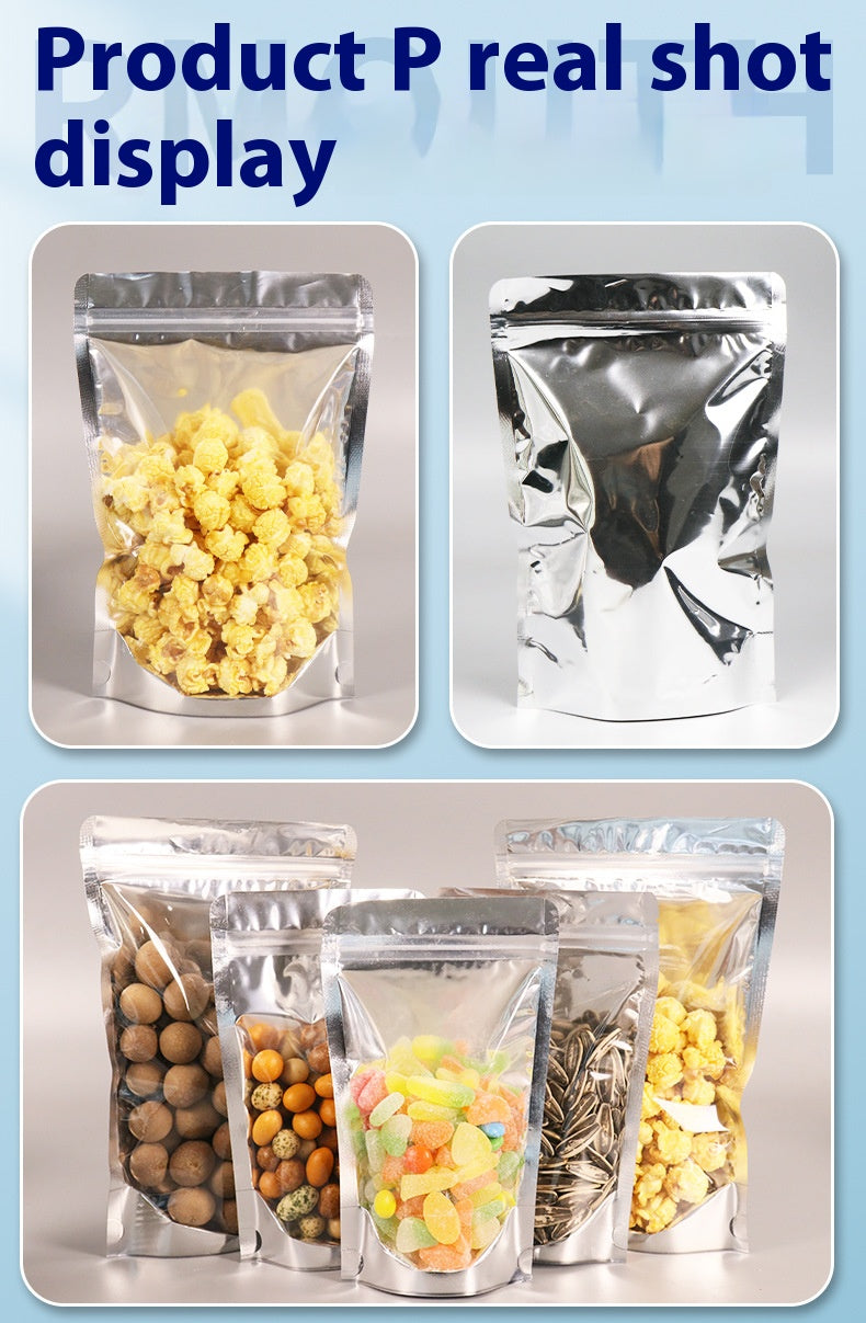 A transparent and silver-colored self-standing zipper self-sealing bag with aluminum coating on both sides is an excellent choice for packaging that combines display and protection. The transparent side clearly shows the contents, enhancing display visibility; the silver aluminum-coated side blocks light and moisture, extending the shelf life of the contents.